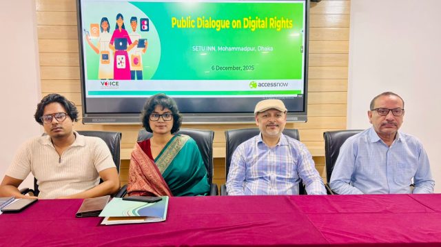 A Public Dialogue on Digital Rights was convened today at Adabar in the capital, bringing together diverse stakeholders, with VOICE, a rights-based organisation committed to promoting freedom of expression, digital rights, and inclusive civic spaces, serving as the organizer. The initiative is supported by Access Now. The dialogue brought together a wide cross-section of participants, including civil society organisations, activists, media professionals, women and youth representatives, lawyers, academicians, and indigenous leaders, marking a significant step toward strengthening collective action on digital rights in Bangladesh.