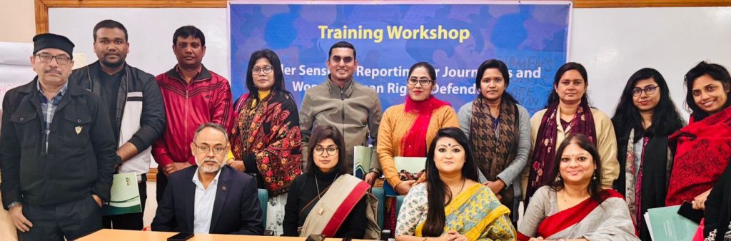 At the workshop held in Dhaka, facilitators highlighted the importance of initiatives to strengthen capacity of journalists and human rights defenders, urging the Ministry of Information and Broadcasting, the Press Institute Bangladesh (PIB) and the Directorate for Women Affairs to take immediate initiatives to provide nationwide gender-sensitive reporting training and formulate gender-sensitive policies, particularly for the newsrooms.